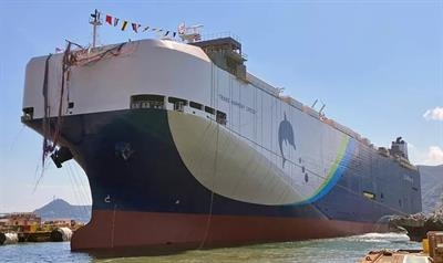 Ro-roMitsubishi Shipbuilding Co., Ltd., held a christening and launch ceremony for the TRANS HARMONY GREEN, the first of two LNG-powered 3,000-CEU capacity PC...