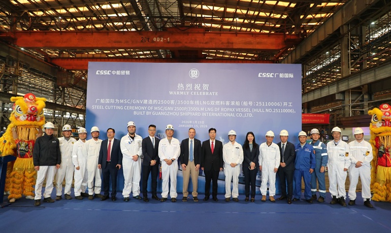 FerryA steel cut ceremony at the GSI shipyard marked the start of production for the first of four planned 237-metre LNG-capable RoPax ferries for MSC/GNV. Details about the ships are so far scarce, but what is known is that they will each have a capacity for 2,500 passengers, hold a 3,500 lane metre freight capacity and include 500 cabins.