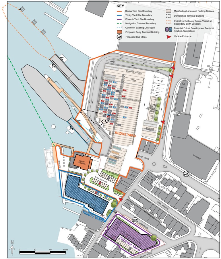 The application site spans Venture Quays, the Trinity House depot and wharf, and the Red Funnel marshalling yard Trinity and Phoenix Yard.