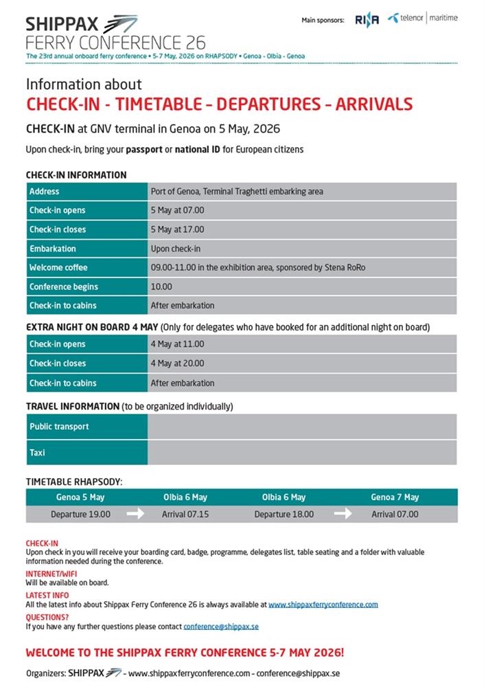 We are happy to announce the timetable to help you plan for the upcoming Shippax Ferry Conference in May next year.