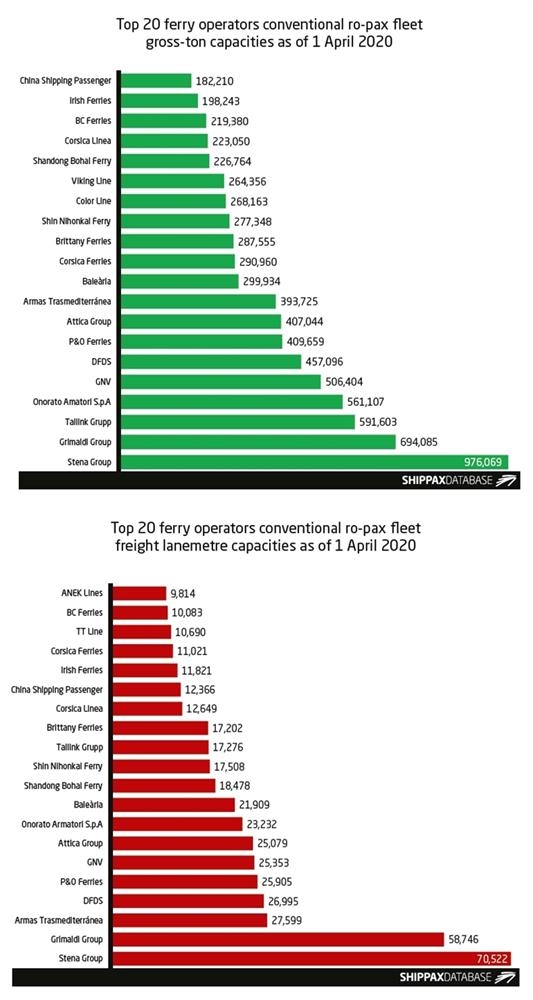 Top 20 conventional ro-pax operators by gross ton and lanemetre capacities, as of 1 April 2020.