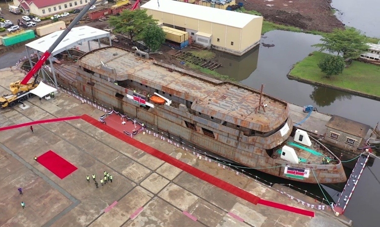 What is being claimed as the first ship yet to be built totally in the East African country of Kenya, by Kenyans, the 100m train ferry UHURU II, has been floated at the newly upgraded Kisumu Shipyard, on Lake Victoria, for Kenya Railways Corp.